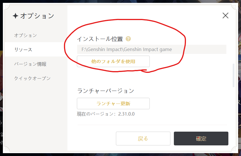 1でコピーしたフォルダ内の"Genshin Impact game"フォルダを設定する